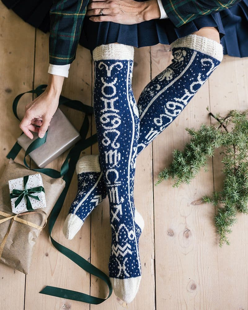 Horoskooppi Socks, designed by Piia Karttunen, add a touch of mysticism to the holiday season. The front and back of the socks are adorned with various zodiac symbols, and the flexible cuff is beautifully crafted with cables and textured stitches. These detailed socks are knitted using Viola yarn.