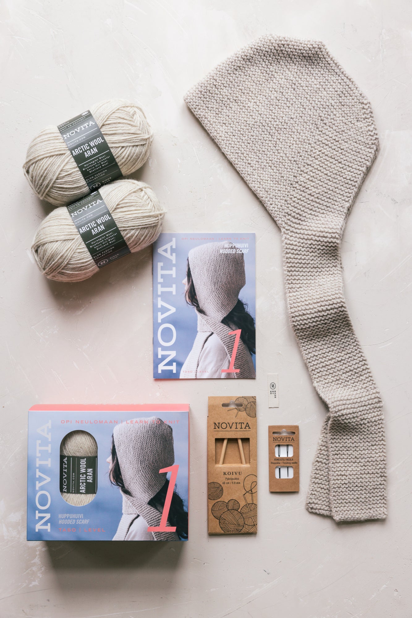 Opi neulomaan huppuhuivi! Huppuhuivi sopii mainiosti aloittelevan neulojan ihan ensimmäiseksi neuletyöksi, sillä tässä neuleessa on vain oikeita silmukoita ja lisäyksiä. Neulekouluvideoiden avulla pääset helposti alkuun. Pakkaus sisältää: ohjevihko (suomi, englanti), 2 x Novita Arctic Wool Aran 100 g, Novita pyöröpuikot koivu 60 cm 5.0 mm, päättelyneula, kangasmerkki.