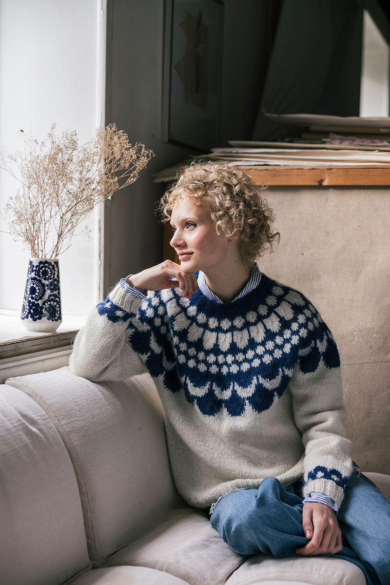 Esteri Tomula designade ursprungligen Esteri-mönstret 1973 för att fira Arabias 100-årsjubileum. Mönstret hamnade på ytan av moderna serviser igen som ett av mönstren i Finland 100 år-jubileumskollektionen. Veera Koivulahti inspirerades av blomsterornamentet som för tankarna till 1970-talet. Den vackra tröjan stickas runt med ärmar och fåll separat i garnet Novita 7 Veljestä. Delarna sammanfogas slutligen i ett färggrant ok i samma anda som det ikoniska porslinsmönstret.